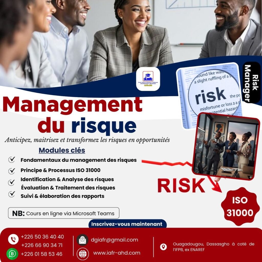 Formation Professionnelle en Management de risque cadre référentiel ISO 31000 brahimacompaore février 12, 2026 Formation 0 Comments Téléchargez le TDR Management de Risque ISO 31000-1 Share this post Facebook Twitter LinkedIn Pinterest Formation Professionnelle en Management de risque cadre référentiel ISO 31000 Navigation de l’article Previous PostSYSTEME DE MANAGEMENT DE LA SANTE ET DE LA SECURITE AU TRAVAIL (SMSST) – ISO 45001 FOUNDATIONNext PostFormation sur la Gouvernance des organismes ISO 37000 : Manager Leave a Comment Annuler la réponse Your Name Your Email Your Comment Recent News Articles Fresh job related news content posted each day. février 12, 2026 Formation 0 Comments SEMINAIRE INTERNATIONAL SUR L’EVALUATION D’IMPACTS ENVIRONNEMENTAUX ET SOCIAUX Téléchargez TDR Fiche Technique EIES Février 2026 Read More février 12, 2026 Formation 0 Comments SYSTEME DE MANAGEMENT DE LA SANTE ET DE LA SECURITE AU TRAVAIL (SMSST) – ISO 45001 IMPLEMENTER Téléchargez le TDR F Lead Implementer ISO 45001 Read More
