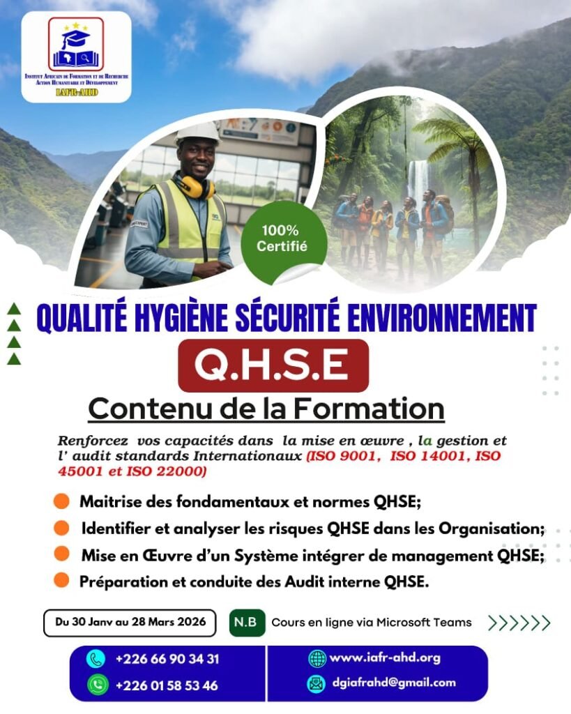 Formation : Qualité, Hygiène, Sécurité et Environnement (QHSE) brahimacompaore janvier 17, 2026 Formation 0 Comments Téléchargez le TDR PDF : formation QHSE Jac Share this post Facebook Twitter LinkedIn Pinterest Navigation de l’article Previous PostSéminaire en finance comptabilité des Institutions et du PrivéNext PostSEMINAIRE INTERNATIONAL PROFESSIONNEL (MEAL/SERA) Leave a Comment Annuler la réponse Your Name Your Email Your Comment Recent News Articles Fresh job related news content posted each day. janvier 19, 2026 Formation 0 Comments FORMATION SUR EXCEL AVANCE Téléchargez le PDF : TDR Formation Excel Avancé Read More janvier 19, 2026 Formation 0 Comments FORMATION SUR POWER POINT AVANCE Téléchargez le PDF : TDR POWER POINT Read More